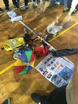 A aula toda ocorreu na quadra do Colégio Universitas. Foram utilizados objetos variados trazidos pelo professor Vinicius, como mochila, sino, garrafa plástica, jornal, sacola, caixa de fósforos, peteca, tiara, potinhos, raquete, guarda chuva, caneta, entre outros... Muitos desses objetos facilmente encontrados em nosso cotidiano.