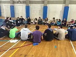 Assim que o andamento do jogo enfraqueceu, ele foi mudado. Agora, dentro da roda foi pedido um voluntário que saiu e ficou de costas a certa distância do grupo. Foi decidido um líder em que todos os outros devem seguir os seus movimentos enquanto ocultam quem é o líder, apenas uma pessoa olhando para o líder, que terá outra olhando para ela e assim consecutivamente gerando uma reação em cadeia dessa movimentação. Então o aluno que se voluntariou entra e fica no centro do círculo e tenta descobrir quem ordena as trocas de movimentação. Na primeira rodada o integrante no centro não conseguiu encontrar quem era o líder por um longo tempo, pois ainda era a primeira vez da atividade e ele não tinha ideia de como funcionavam as engrenagens para o pessoal se mover, e a cooperação tornou difícil essa identificação até o professor colocar uma regra que estabeleceu um equilíbrio para este momento, aonde a um sinal dele os movimentos deveriam ser trocados, e a partir daí, o primeiro a mudar era o líder, e logo em seguida ele foi encontrado. Com essa mudança e com todos agora entendendo os mecanismos usados para tentativa de ocultação, ficaram difíceis as mudanças de movimentos.