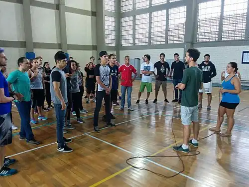 Com os alunos reunidos em um lado da quadra, duas pessoas ( o professor, e uma auxiliar) seguraram uma corda , um em cada ponta, e foram correndo na direção dos alunos, obrigando-os a desviar dessa corda. Parecia simples, porém depois a dificuldade começou a aumenta, quando essa corda começou a vir com ondulações, vir mais rápida, etc, o que acabou exigindo maior concentração dos alunos que estavam envolvidos para desviar dessa corda. Passada essa primeira parte, começaram a surgir as primeiras regras, o que acabou tornando a brincadeira mais difícil. Essas regras criadas previamente, levaram a percepção de que era necessário se trabalhar em equipe, um ajudando o outro a realizar a atividade. Uma das atividades era pular corda em duplas, o que fazia com que um ajudasse o outro. Depois o grupo foi aumentando, e isso tornou evidente a necessidade de uma “ consciência coletiva”, onde um percebia a limitação do outro e tentava de alguma maneira contorna-la, para que o grupo todo tivesse êxito.