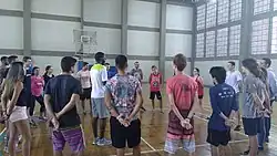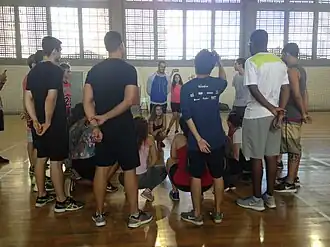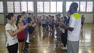 A primeira parte foi realizada uma aula prática, onde o professor realizou algumas atividades. A primeira delas foi a brincadeira do viúvo, onde os alunos se organizam em roda em pé, e pra cada pessoa em pé, uma pessoa sentada a sua frente, exceto uma pessoa, que no caso é o "viúvo", o viúvo deve piscar para uma das pessoas que estejam sentadas e assim arrumar um par e quem está em pé deve proteger seu par, tocando no ombro da pessoa antes que ela saia a encontro do viúvo. A segunda atividade é "siga o mestre", a organização também é em roda, onde uma pessoa dita as ações de toda a roda, assim escolhemos uma pessoa para que descubra quem é esse líder, então, ela fica de costas e fora da roda, se escolhe o líder, depois a pessoa que estava de fora, entra na roda e tenta descobrir quem está ditando as ações. A terceira atividade foi "espelho e líder", que é igual o siga o mestre, porém a organização é em duas fileiras, uma de frente para a outra, e a pessoa que fica de fora deve descobrir qual lado comanda as ações. A quarta atividade foi a "Nossa, que legal" onde em duplas uma pessoa perguntava para a outra "Sabe o que eu sei fazer?" a outra respondia "Não, deixa eu ver?" aí era realizada uma ação onde a outra pessoa respondia "Nossa, que legal!" e imitava a ação feita. E de duplas foram montando grupos maiores.