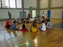 Durante a aula o espaço utilizado foi a quadra desportiva. Um dos materiais foi uma caneta esferográfica, a criatividade e um grupo de pessoas, sendo esse essencial para a realização da atividade.
