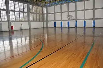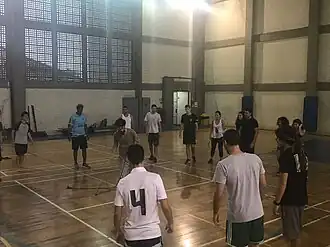 Professor espalhou bambolês pela quadra, juntaram-se em duplas. A dupla de fora foi dividido em participante um: joga a bola para o segundo, o segundo participante batia na bola ou chutava e falava o nome de algum aluno. Quando o segundo participante da dupla falava o nome, todos os alunos tinham que correr pela quadra com sua dupla e achar um bambolê para ficar. O aluno chamado, se conseguisse, tinha que pegar a bola e ir correndo para um dos bambolês, se desse certo, a dupla que ficou de fora tinha que fazer a mesma coisa, como um ciclo, arremessar e bater na bola. A dupla tinha que manter de mão dada durante todo jogo e a rodada.