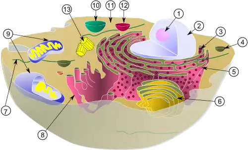 Cromossomo(1) Cromatídeo. Cada um dos dois braços idênticos dum cromossoma depois da fase S. (2) Centrómero. O ponto de ligação de dois cromatídeos, onde se ligam os microtúbulos. (3) Braço curto. (4) Braço longo.Estrutura de uma (celula) animal típica: 1. Nucléolo, 2. Núcleo celular, 3. Ribossomos, 4. Vesículas, 5. Ergastoplasma ou Retículo endoplasmático rugoso (RER), 6. Complexo de Golgi, 7. Microtúbulos, 8. Retículo endoplasmático liso (REL), 9. Mitocôndrias, 10. Vacúolo, 11. Citoplasma, 12. Lisossomas, 13. Centríolos.