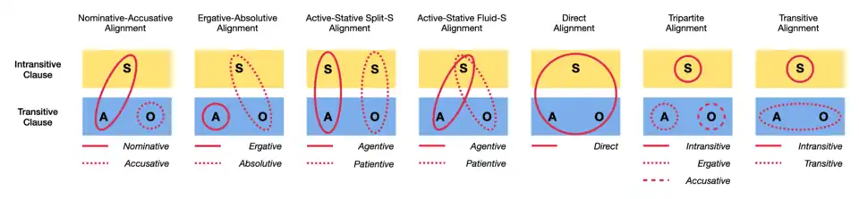 A ordem da frase e o alinhamento são as estruturas morfossintáticas que regem a língua. A ordem da frase diz respeito à ordem na qual os elementos sintáticos aparecem em uma frase. Na língua portuguesa, por exemplo, a ordem canônica, ou seja, a mais usual e melhor compreendida, é SVO (sujeito - verbo - objeto). Além disso, o mais comum é que, dentro de um sintagma nominal, o núcleo apareça antes de suas modificações (como em "roupa suja" ou "céu azul", em vez de "suja roupa" ou "azul céu"). O alinhamento morfossintático é a relação estabelecida entre os sujeitos e objetos das orações transitivas e intransitivas. Na língua portuguesa, por exemplo, o sujeito de um verbo intransitivo geralmente é associado ao agente de um verbo transitivo, sendo ambos enxergados como uma entidade mais próxima um do outro do que ambos do objeto de um verbo transitivo. É como se o objeto fosse uma entidade mais distante dentro do universo sintático. Por isso, o português é uma língua descrita como nominativa-acusativa, ainda que gramaticalmente isso tenha pouco efeito. Há línguas em que essas relações podem ser compreendidas de maneiras diferentes, como nas ergativas-absolutivas; gramaticalmente, todas essas relações podem ser marcadas pelos casos gramaticais. Na língua portuguesa, esses casos foram preservados apenas em alguns pronomes pessoais (o motivo da diferença entre "eu", "me" e "mim"), porém não há marcação, por exemplo, nos substantivos. No outro extremo, há línguas em que os substantivos podem ser classificados em diversos casos gramaticais distintos, como o húngaro, que apresenta 18 ao todo.