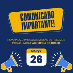Ampliamos para dia 26 de março de 2023 (domingo) o prazo da chamada de resumos para o livro “A Wikimedia no Brasil: o poder e os desafios do conhecimento livre”(nome a confirmar). A ampliação é resultado da demanda dos autores que passam a ter mais duas semanas para enviar suas propostas. O livro é uma iniciativa do WMB e tem como objetivo celebrar o trabalho e reunir histórias sobre a trajetória das pessoas que protagonizam o desenvolvimento da Wikimedia no Brasil.