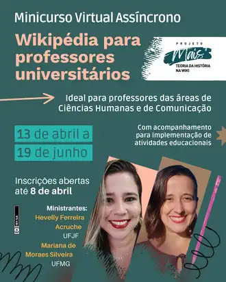 O Projeto Mais Teoria da História na Wiki vai oferecer, entre os dias 13 de abril a 19 de junho de forma online e assíncrona, o minicurso Wikipédia para professores universitários. Em cinco módulos, as professoras Hevelly Ferreira Acruche e Mariana de Moraes Silveira vão ensinar como integrar a Wikipédia, o Wikidata e o Wikimedia Commons ao ensino superior, explorando seu potencial para a divulgação científica e a extensão universitária.