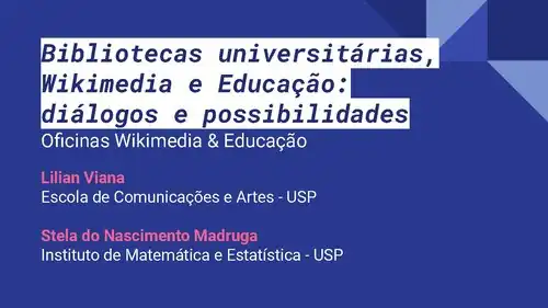 PalestrantesStela Madruga e Lilian VianaStela Madruga: Bibliotecária, especialista em Gerência de Projetos (USJT), mestra em Gestão da Informação (ECA/USP), atualmente é responsável pela Biblioteca do Instituto de Matemática e Estatística e participante do GLAM/Bibliotecas USP. Lilian Viana: Bibliotecária, mestra em Ciência da Informação (ECA/USP), atualmente é doutoranda em Ciência da Informação (ECA/USP), desenvolvendo estudo na linha de pesquisa Apropriação Social da Informação. Atua como bibliotecária na Biblioteca da ECA/USP e integra o GLAM/Bibliotecas USP. Página: GLAM das Bibliotecas da USP Alexandre MontilhaDoutorando e Mestre em Ciências pela Universidade de São Paulo (USP), e graduado em Sistemas de Informação pela Universidade Estadual Paulista (UNESP). Atua na área de tecnologia educacional, com recursos educacionais abertos, aplicações multiplataforma e pesquisas voltadas para a educação em saúde. É editor da Wikipédia desde 2008, e atua, globalmente, e com maior ênfase, na linha do metapedianismo nos projetos da Fundação Wikimedia. Mais recentemente, tem se envolvido com atividades do Grupo de Usuários da Comunidade Wikimedia no Brasil, coordenando ou oferecendo suporte a algumas campanhas na plataforma Outreach Dashboard, além da participação em palestras, wiki-encontros ou disciplinas de pós-graduação na USP. |