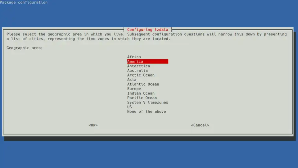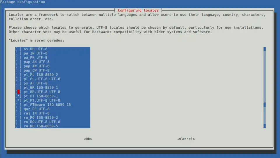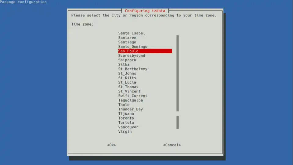 O primeiro é para a configuração de idioma, enquanto que o segundo para a configuração do fuso horário. Executado esse comando, a seguinte tela aparece: