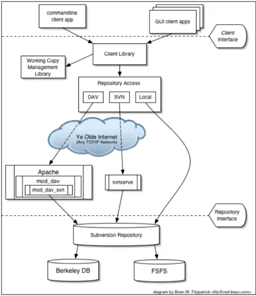 Em uma ponta encontra-se um repositório do Subversion que mantém todos os seus dados versionados. No outro extremo está o seu programa cliente Subversion, que gerencia cópias locais de partes desses dados versionados (chamadas de “cópias de trabalho”). Entre esses dois extremos estão múltiplas rotas por entre várias camadas de Acesso ao Repositório (RA). Algumas dessas rotas partem das redes de computadores até os servidores de rede, de onde então acessam o repositório. Outras desconsideram a rede completamente e acessam diretamente o repositório.