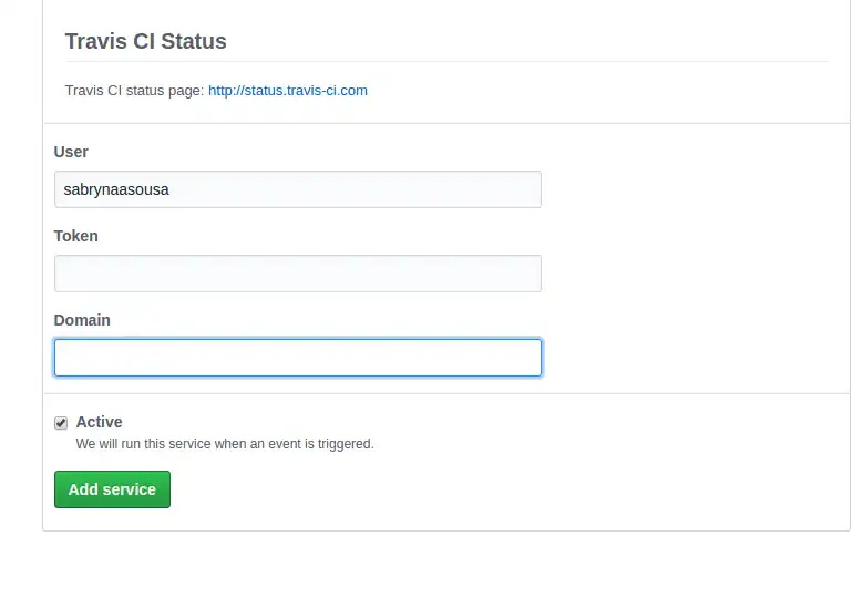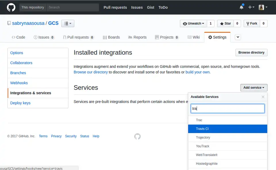 - Selecione a opção “Integrations & services” na aba lateral. Após clicar serão mostradas opções ao lado para adicionar serviços como o Travis. Para isto, clique em “Add Service”, procure pelo “Travis” e clique. Ao adicionar o serviço, será necessária uma confirmação com a senha de usuário do git.