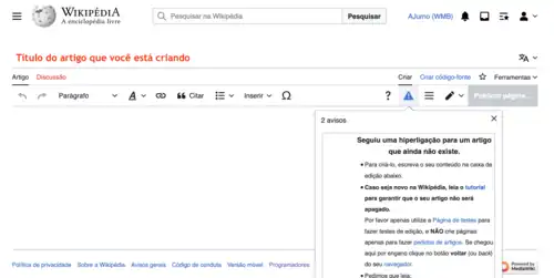 Você também pode criar uma página a partir da barra de endereço do seu navegador (browser). Para isso, digite o texto a seguir na barra de endereço, substituindo 'nome do artigo' pelo título do artigo a ser criado.