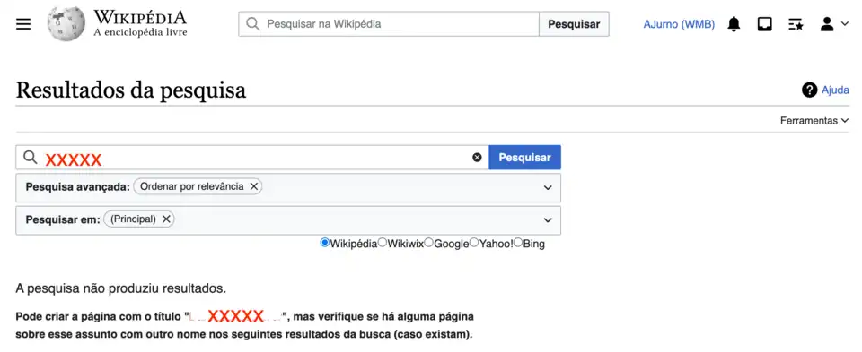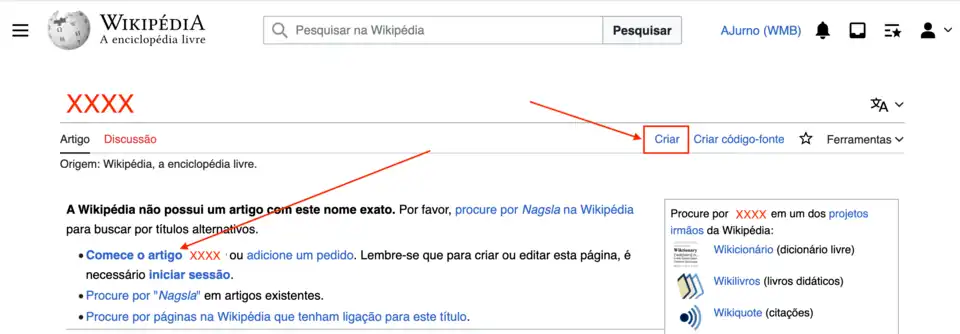 Se o endereço o levar a um artigo já existente, você pode editá-lo. Caso o artigo não exista na Wikipédia, você verá a mensagem ilustrada na imagem a seguir, onde XXXX é o nome que você digitou.