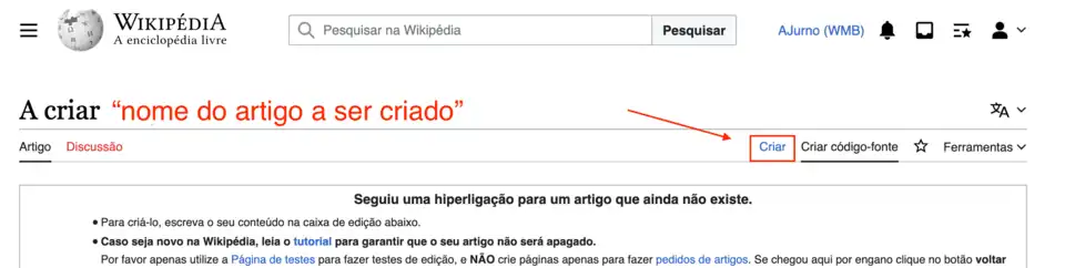 Você pode clicar em um link em vermelho, no meio do texto de um artigo. Ao fazer isso, você será redirecionado para criar uma nova página com aquele nome. Contudo, note que ela será aberta em modo "Criar código-fonte", clique em "Criar", conforme indicado na imagem abaixo, para abrir o editor visual.