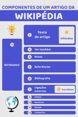 No esquema ao lado, feito com base em um diagrama produzido pela comunidade, é possível entender a organização dos componentes de um artigo da Wikipédia: texto, infocaixa, ver também, notas, referências, bibliografia, ligações externas, correlatos, navboxes, portais, categorias e interwikis.