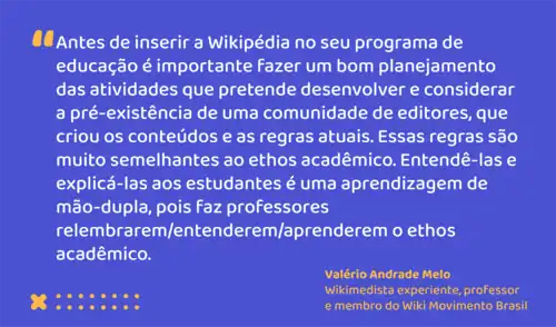 *O conteúdo desta unidade foi baseado em e/ou traduzido do programa "How to teach with Wikipedia", desenvolvido pela WikiEdu – uma organização que serve de ponte entre a Academia e a Wikipédia, do programa "Reading Wikipedia in the Classroom", desenvolvido pelo time de Educação da Fundação Wikimedia, e da série "Enseñar con Wikipedia", uma iniciativa do Programa de Educación y Derechos Humanos da Wikimedia Argentina.