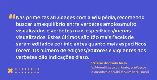 Educadores também podem trabalhar com os estudantes a criação de verbetes sobre conteúdos inexistentes em suas áreas de atuação. Verbetes com biografias de personalidades nacionais e/ou de grupos historicamente marginalizados; verbetes de monumentos, instituições e organizações nacionais; verbetes de espécies e materiais característicos da região brasileira; verbetes de culturas e costumes populares; ou sistematização de informações de interesse público que estão disponíveis na internet, mas são de difícil acesso como bases de dados sobre os mortos e desaparecidos na ditadura militar, dentre outros.