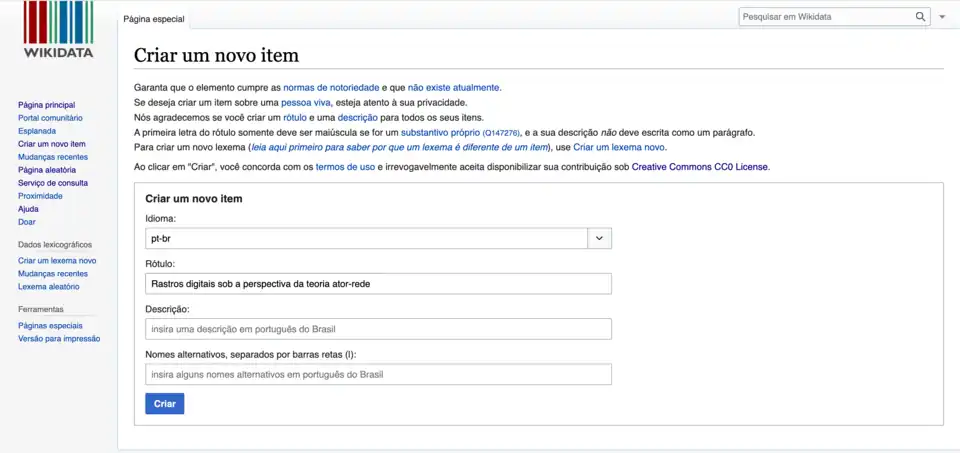 Conforme ilustrado na imagem abaixo, você deverá receber uma mensagem semelhante afirmando que o item não existe no Wikidata, substituindo o "xxxx" pelo nome que você digitou na busca. Note que lhe é oferecida a opção "criar um novo item".Nenhum resultado corresponde a esta pesquisa. Você pode criar um novo item para "Rastros digitais sob a perspectiva da teoria ator-rede (aqui estará o nome do seu artigo)".