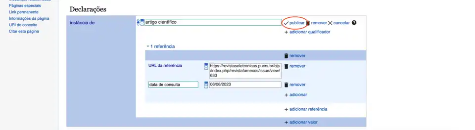 A referência que vamos adicionar é o site da revista onde o artigo foi publicado. Por isso, selecionamos a propriedade "URL da referência" (P854) e inserimos o link em questão. Caso esteja satisfeito com essas informações, basta clicar em publicar.
