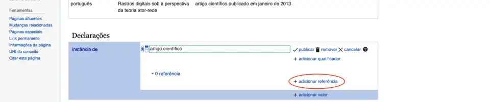 Lembre-se que o Wikidata é uma base de dados secundária e, portanto, todas as informações devem ter lastro. Clique em "adicionar referências", no lado direito da parte inferior da caixa que está sendo editada – conforme destacado em vermelho na imagem abaixo.