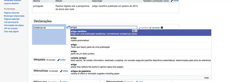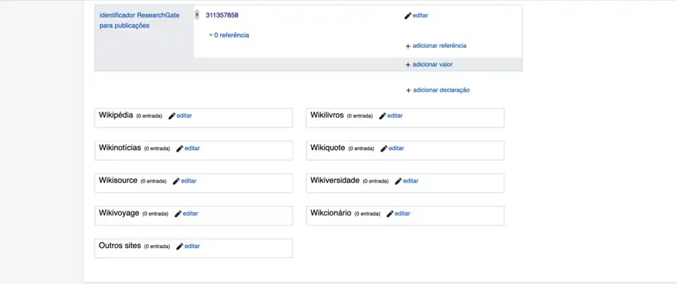 Quando o item que se está criando tem uma versão na Wikipédia, por exemplo, podemos clicar em "editar" na frente de Wikipédia e inserir o link correspondente naquele projeto.
