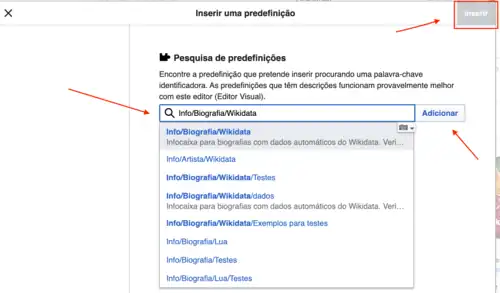 Para inserir caixas de informação automatizadas na Wikipédia, clique no menu com sinal de + "Predefinição" e insera o texto Info/Biografia/Wikidata na caixa de busca, conforme indicado nas imagens abaixo.