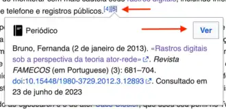 Caso queira fazer alguma alteração na referência, clique em "Inserir". Depois, clique no número relativo à referência no texto do verbete que você está editando. Como é possível ver na imagem abaixo, ao clicar no número [5] uma janela com os dados da referência é exibida. Note que há um botão "Ver" no canto superior direito da janela – clique nele para editar os dados inseridos.