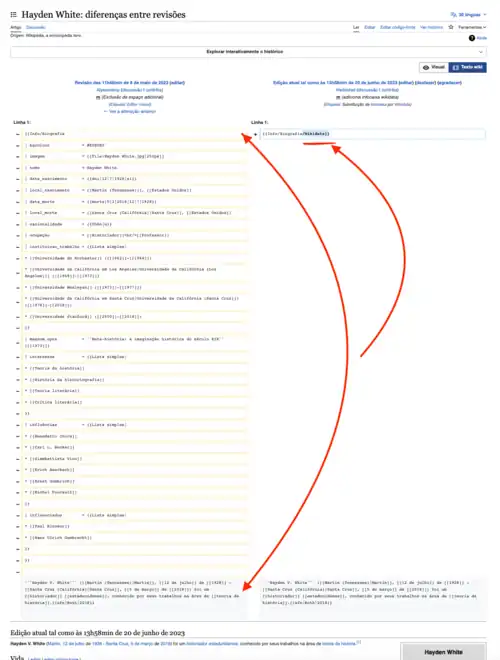 Além disso, o processo de criação das caixas de informação via Wikidata é muito mais simples (e amigável) do que o modo tradicional – que inclui a criação manual do código-fonte. Exemplificamos com o histórico de edições do verbete do autor Hayden White, retratado na imagem abaixo. Como vemos, todo o bloco de código inserido de forma manual (exibido no lado esquerdo da tela e destacado em amarelo) foi substituído por apenas uma palavra no código em questão (exibido do lado direito e destacado em azul): Wikidata.