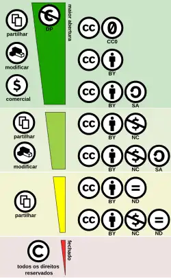 - ↑ 3,0 3,1 Tipos de licença: https://pt.wikipedia.org/wiki/Licen%C3%A7as_Creative_Commons.