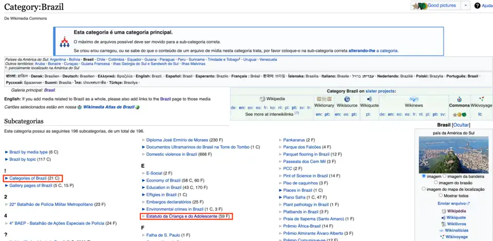 Por exemplo, ao acessar a categoria "Brazil" (retratada na imagem abaixo) você encontra várias subcategorias ligadas ao grande tema "Brasil" como "Estatuto da Criança e do Adolescente, Views_of_Brazil e Nature_of_Brazil. Note que, na frente dos nomes das subcategorias há algumas letras e números – referentes ao número de categorias, arquivos (files) e páginas contidos em determinada subcategoria. A categoria Estatuto da Criança e do Adolescente, por exemplo, apresenta a combinação 59 F na frente do seu nome, uma referência aos 59 arquivos internos. Já na categoria Categories of Brazil, o 21 C aponta suas 21 categorias internas.