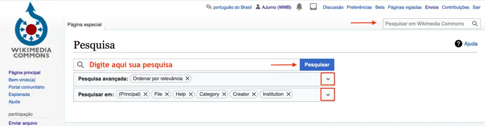 Note que a maioria das imagens no Commons encontram-se descritas em inglês e você obterá mais resultados se pesquisar neste idioma. Isso não impede que faça também pesquisas em outros idiomas, uma vez que as legendas em português podem ainda não ter sido inseridas nas imagens que te interessam.