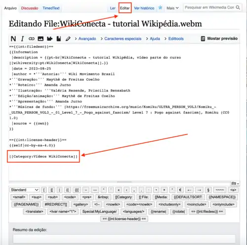 Mas, assim como na Wikipédia, os arquivos não são categorizados automaticamente. As categorias são criadas por pessoas e depois atribuídas pelos itens de acordo com a escolha dos editores. Dessa forma, qualquer usuário interessado pode contribuir para ordenar e classificar os arquivos dentro da estrutura de categorias. Para isso basta indicar no campo "Categorias" ao carregar o arquivo. Caso já tenha feito o upload e queira alterar a categoria, ou mesmo inserir uma em falta, basta clicar em "editar" no topo da página do arquivo e inserir o seguinte código no fim da página: [[Category:Nome da categoria]], conforme exemplificado na imagem abaixo. Não se esqueça de publicar as alterações clicando no botão azul localizado ao fim da janela de edição.