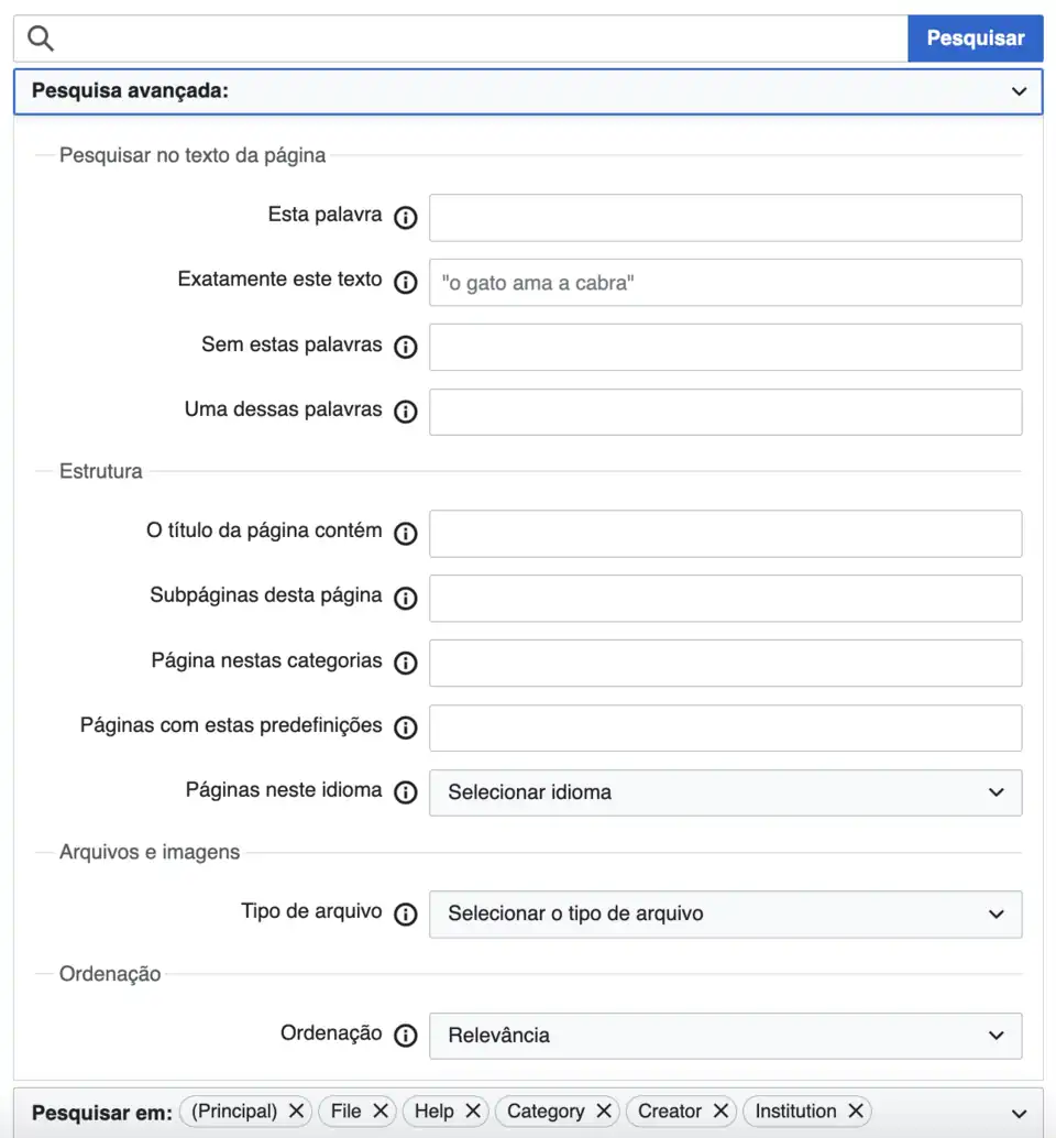 Na imagem acima, observamos dois destaques abaixo do botão "pesquisar", do lado direito. Estas setas abrem caixas de diálogo com opções avançadas de busca: A primeira com opções de tipos de página onde será feita a pesquisa e a segunda seta exibe as opções de busca do conteúdo dessas páginas. Em ambas, é possível limitar a pesquisa e aumentar a chance de encontrar resultados que atendam às suas necessidades.